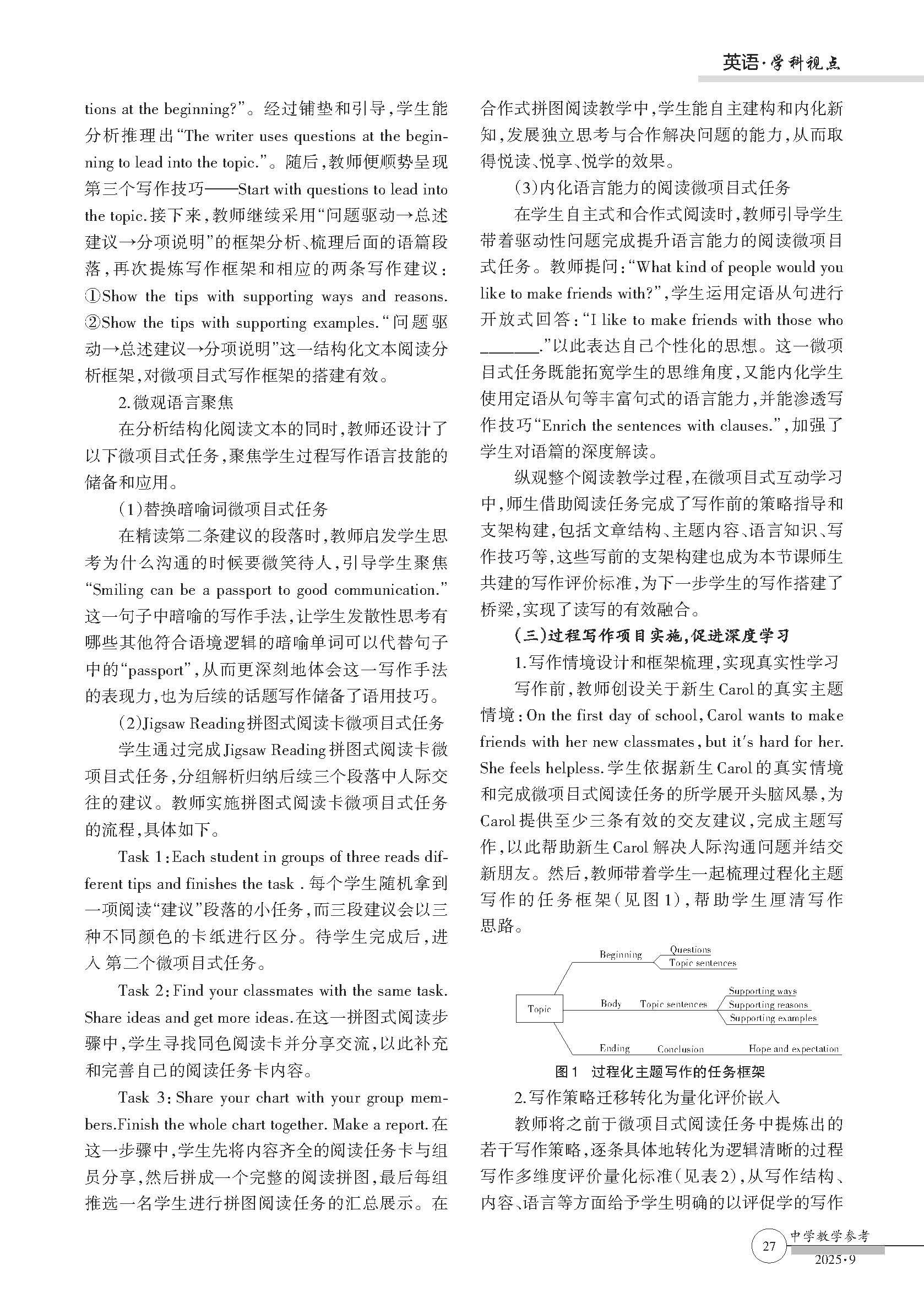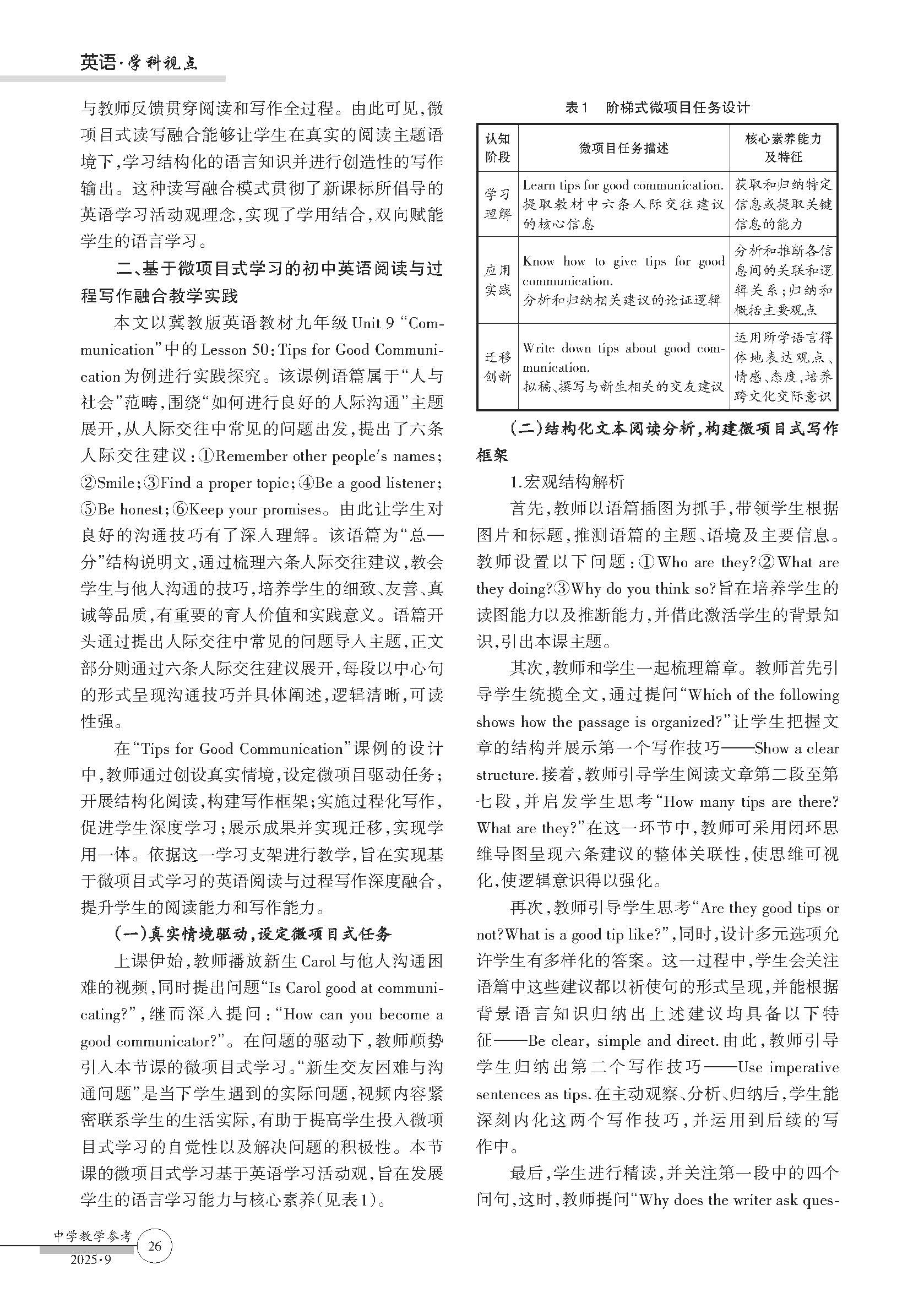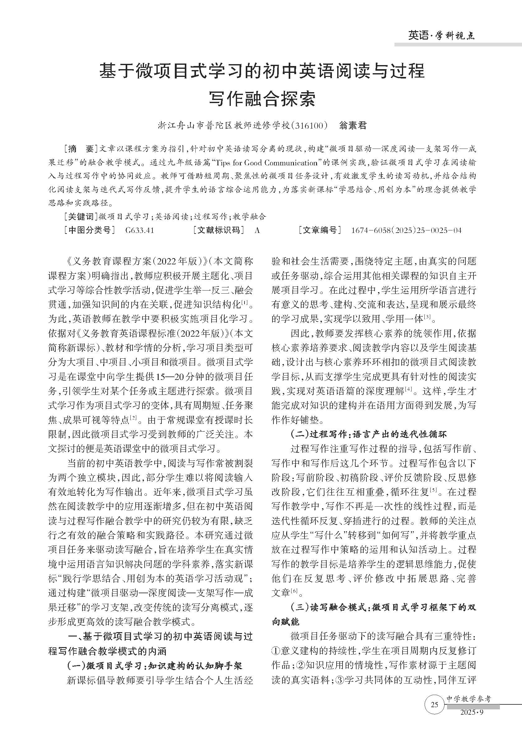 基于微项目式学习的初中英语阅读与过程写作融合探索